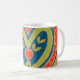 Eine weiße Tasse mit dekorativem Herzdesign in Rot, Blau, Grün und Gold aus einem Aquarellbild von Judy Adamson.