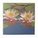 DIE DEKORATIVE KERAMIK TILE VERFÜGT ÜBER ZWEI BEIDE PALETTEN-LOTUS-BLOSSOME, DIE ZU DEN LILY PADS GEHÖREN. DIE LOTUS-BLOSSOME SIND IM WASSER REFLEKTIERT.