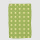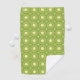 Grünes Handtuchset mit geometrischem Muster aus gelben Sternen und Diamanten. Das obere Bild zeigt hängende Handtücher; unten ist ein Waschlappen mit gefalteter Ecke zu sehen.