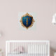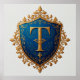 Ortisch entworfene heraldische Schilde mit einem goldenen Buchstaben T, umgeben von aufwändigen Goldverzierungen auf blauem Hintergrund. Elegantes Detail erinnert an Tradition, Königtum und Raffinesse.