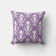 Dekoratives Throwkissen mit einem lila Damastmuster. Handgemacht in den USA. Großes Baumwollkissen mit einem Vintagen Damastentwurf im Weiß auf einem lila Hintergrund.