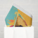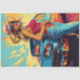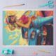 Eine stilisierte Abbildung einer Person, die neben einem Oldtimer stehend ist. Die Person trägt einen breit gebrannten Hut, ein rotes Oberteil und Jeans aus Denim. Das Auto verfügt über herausragende Hecktafeln und rundliche Scheinwerfer, was auf ein Vintages amerikanisches Automobildesign hinweist. Der Hintergrund ist abstrakt in Gelb-, Blau- und Rottönen gehalten und verleiht der Szene eine lebendige und künstlerische Touch