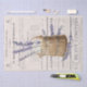 Ein Holzeimer voller lila Lavendel-Blume vor dem Hintergrund Vintager französischer Typografie. Ideal für Entkoppelung.