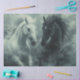 Das Bild zeigt zwei Pferde, eines weiß und eines schwarz, die durch Wasser laufen. Das weiße Pferd ist auf der links Seite des Bildes, das schwarze Pferd auf der rechten Seite. Die Pferde haben fließende Mähne und Schwänze, und das Wasser spritzt um sie herum und schafft eine dynamische und kraftvolle Szene. Der Kontrast zwischen den weißen und schwarzen Pferden ist auffallend, und die Atmosphäre ist insgesamt dramatisch und intensiv. Dieses Bild ist interessant wegen des Kontrastes zwischen den beiden Pferden und dem Gefühl von Bewegung und Energie, das es vermittelt. Weißes Pferd, schwarzes Pferd, durch Wasser laufen, fließende Mähne, dynamische Szene, kraftvolle Bilder, Wasserspritzen, dramatische Atmosphäre, intensiver Kontrast, Bewegung und Energie, markante visuelle, RHDezeichen von 2chattychicks.