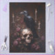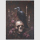 Ein schwarzer Rabe besteigt einen menschlichen Schädel, umgeben von tiefroten und lila Rose, dornigen Zweigen und glühenden Kerzen