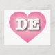 Diese Postkarte weist ein ruhiges, cooles rosafarbenes Herz mit einem weiß gekalkten Zentrum auf, das die fett weißen Großbuchstaben DE, die offizielle Abkürzung für den Staat Delaware, den ersten Staat, enthält. Die Rückseite der Postkarte ist leer und wartet auf Ihre handgeschriebenen Stimmungen oder Ihren personalisierten Text.