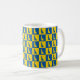 Celebrate Delaware pride with a bold, modern twist. This original design features a repeating grid of blue and yellow squares, each showcasing a clean, minimalist Delaware silhouette on a mug.