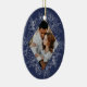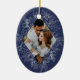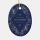 Ein modernes und elegantes Urlaubsornament, das Ihr vertikal oder portrait orientiertes Foto in einem wunderschön detaillierten, rautenförmigen Rahmen mit heiligen Blätter, Beeren und Wintern-Blätter auf einem blauen Hintergrund umrahmt. Personalisieren Sie die Rückseite dieses einzigartigen Weihnachtsschmucks mit Ihrem Familiennamen und dem Jahr.