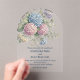 An acrylic wedding invitation featuring delicate hydrangea flowers in shades of dusty rose, light purple, and blue.