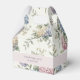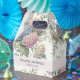 A wedding favor box featuring delicate hydrangea flowers in shades of dusty rose, light purple, and blue.