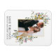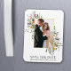 Moderne Wildblume Hochzeit Hochzeit Hochzeit Verlobung Ankündigung Save The Date Magnet umfasst gelbe, rosa, lila, staubblaue und weiße wilde Blume, Eukalyptus-Blätter, Salbei-grüne Blätter und andere botanische Vegetation auf einem goldenen Rahmen. Ein paar Fotos.
