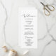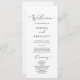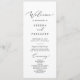Dieses delikate, schwarze kalligraphische Hochzeitsfeierprogramm ist perfekt für eine moderne Hochzeit. Das romantische minimalistische Design besticht durch eine hübsche und elegante schwarze Typografie auf weißem Hintergrund mit einem sauberen und schlichten Look. Geben Sie den Namen der Braut und des Bräutigams, das Datum und den Ort der Hochzeit, Dankeschön-Nachricht, Dienstordnung, Brautparty und ein optionales "in Loving Memorial" ein.
