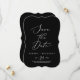 Diese zarte dunkle schwarze kalligraphische Hochzeit speichern Sie das Datum Ankündigung Karte ist perfekt für eine moderne Hochzeit. Das romantische minimalistische Design besticht durch eine hübsche und elegante weiße Typografie auf schwarzem Hintergrund mit einem sauberen und schlichten Look.