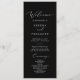 Dieses delikate, dunkelschwarze kalligraphische Hochzeitsprogramm ist perfekt für eine moderne Hochzeit. Das romantische minimalistische Design besticht durch eine hübsche und elegante weiße Typografie auf schwarzem Hintergrund mit einem sauberen und schlichten Look. Geben Sie den Namen der Braut und des Bräutigams, das Datum und den Ort der Hochzeit, Dankeschön-Nachricht, Dienstordnung, Brautparty und ein optionales "in Loving Memorial" ein.