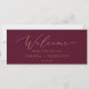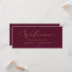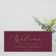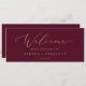 Dieser zarte, goldbordeauxfarbene, hängende Sitzcharts-Willkommenskopf eignet sich perfekt für eine moderne Hochzeit. Das romantische minimalistische Design besticht durch eine hübsche und elegante Champagner-goldgelbe Typografie auf bordeauxrotem Hintergrund mit einem klaren und schlichten Look. Die Karte druckt auf der Vorder- und Rückseite (beidseitig). Bitte Karo der Auflistung für die koordinierenden Tischnummer-Kartenkarten.