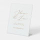 Dieses delikate Gold Share die Liebe Hochzeit Hashtag Podest-Schild ist perfekt für eine moderne Hochzeit. Das romantische minimalistische Design besticht durch eine hübsche und elegante Champagner-goldgelbe Typografie auf weißem Hintergrund mit einem klaren und schlichten Look. Personalisieren Sie das Zeichen mit Ihrem Hochzeitshashtag.