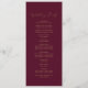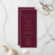 Dieses delikate goldkalligraphische burgundische Hochzeitsfeierprogramm ist perfekt für eine moderne Hochzeit. Das romantische minimalistische Design besticht durch eine hübsche und elegante Champagner-goldgelbe Typografie auf bordeauxrotem Hintergrund mit einem klaren und schlichten Look. Geben Sie den Namen der Braut und des Bräutigams, das Datum und den Ort der Hochzeit, Dankeschön-Nachricht, Dienstordnung, Hochzeitsfeier und ein optionales "in Loving Memorial" ein.