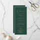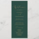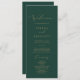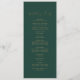 Dieses zarte goldkalligraphische grüne Hochzeitsfeierprogramm ist perfekt für eine moderne Hochzeit. Das romantische minimalistische Design besticht durch eine hübsche und elegante Champagner-goldgelbe Typografie auf smaragdgrünem Hintergrund mit einem klaren und schlichten Look. Geben Sie den Namen der Braut und des Bräutigams, das Datum und den Ort der Hochzeit, Dankeschön-Nachricht, Dienstordnung, Hochzeitsfeier und ein optionales "in Loving Memorial" ein.