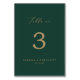 Der zarte goldkalligraphische grüne Tisch Nr. Tischnummer ist perfekt für eine moderne Hochzeit. Das romantische minimalistische Design besticht durch eine hübsche und elegante Champagner-goldgelbe Typografie auf smaragdgrünem Hintergrund mit einem klaren und schlichten Look. Die Karte druckt auf der Vorder- und Rückseite (beidseitig). Die Artikel werden genau so gedruckt, wie sie auf dem Bildschirm erscheinen, wenn Sie sie zum Warenkorb hinzufügen, sodass Sie jede Tischnummer, die Sie benötigen, individuell anpassen und hinzufügen können.