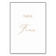 Dieser zarte Goldkalligraphietisch mit vier Tischnummern eignet sich perfekt für eine moderne Hochzeit. Das romantische minimalistische Design besticht durch eine hübsche und elegante Champagner-goldgelbe Typografie auf weißem Hintergrund mit einem klaren und schlichten Look. Die Karte druckt auf der Vorder- und Rückseite (beidseitig). Andere Tischnummern in der Sammlung werden separat verkauft.