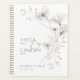 Dieses Hochzeitsplaner-Design zeichnet sich durch ein weiches, floralfarbenes Spray aus Weiß, Grau und Imitat aus. Der Rücken setzt das Design fort und beinhaltet auch die ersten Initialen des Paares, sowie das Hochzeitstag. Dieses Design ist Teil der Delicate Modern White Gray und Gold Floral Hochzeitssuite von Karten erstellt von Simply Farmhouse Press.