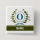 Ein zarter Efeu-Kranz mit einem blau gestreiften Bogen liegt auf einem frischen weißen Hintergrund. Das passende Hochzeitsdesign zeichnet sich durch das Monogramm "O" in blau aus. Button kann mit beliebigem Namen über dem grünen Band-Banner personalisiert werden. Design-Tipp: Verwenden Sie für den hier gezeigten Schriftart alle Caps für den Namen.