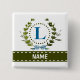 Ein zarter Efeu-Kranz mit einem blau gestreiften Bogen liegt auf einem frischen weißen Hintergrund. Das passende Hochzeitsdesign zeichnet sich durch das Monogramm "L" in blau aus. Button kann mit beliebigem Namen über dem grünen Band-Banner personalisiert werden. Design-Tipp: Verwenden Sie für den hier gezeigten Schriftart alle Caps für den Namen.
