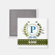 Ein zarter Efeu-Kranz mit einem blau gestreiften Bogen liegt auf einem frischen weißen Hintergrund. Das passende Hochzeitsdesign zeichnet sich durch das Monogramm "P" in blau aus. Magnet kann mit jedem Namen über dem grünen Band-Banner personalisiert werden. Design-Tipp: Verwenden Sie für den hier gezeigten Schriftart alle Caps für den Namen.