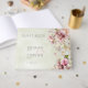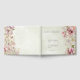Dieses Gästebuchdesign besticht durch ein sanftes, blumengeschmücktes Spray aus Weiß, Rosa, Creme und Rose. Die Rückseite setzt das Design fort. Dieses Design ist Teil der Delicate Modern Pink Blush Rose und Lily Hochzeitssuite der Karten erstellt von Simply Farmhouse Press.