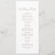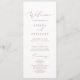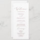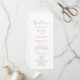 Dieses delikate Hochzeitsfest in Rose mit Gold ist perfekt für eine moderne Hochzeit. Das romantische minimalistische Design besticht durch eine hübsche und elegante, staubige Rose mit rosa Typografie auf weißem Hintergrund. Geben Sie den Namen der Braut und des Bräutigams, das Datum und den Ort der Hochzeit, Dankeschön-Nachricht, Dienstordnung, Brautparty und ein optionales "in Loving Memorial" ein.