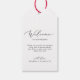 Diese delikaten, schwarzen kalligraphischen Begrüßungstags sind perfekt für eine moderne Hochzeit. Das romantische minimalistische Design besticht durch eine hübsche und elegante schwarze Typografie auf weißem Hintergrund mit einem sauberen und schlichten Look. Personalisieren Sie die Tags mit dem Ort Ihrer Hochzeit, eine kurze Begrüßung, Ihre Namen und Hochzeitsdatum. Diese Tags sind ideal für Hochzeiten in Urlaubsort und Begrüßungstaschen für Hotelgäste.