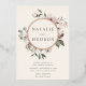 Elegante Winterblumeneinladungen mit Ihren Namen, umrahmt von einem goldenen Rose-Folienkranz mit Aquarellfarben-Blume und Blattwerk auf Elfenbeinhintergrund. Die Blume sind in einer Farbpalette mit staubiger Rose, hellrosa, Elfenbein und sanft goldgelber Farbe gehalten, mit Eukalyptus-Blätter und Winterfolien in den Farbtönen von Salbeigrün und üppigem Waldgrün.