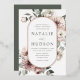 Elegante Winterblumeneinladungen mit Ihren Hochzeitsdetails in dunkelgrüner Schrift eingebettet in eine Rose goldene Folie mit ovalem Blumenrahmen. Die Blume sind in einer Farbpalette mit staubiger Rose, hellrosa, Elfenbein und sanft goldgelber Farbe gehalten, mit Eukalyptus-Blätter und Winterfolien in den Farbtönen von Salbeigrün und üppigem Waldgrün.