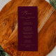 Diese delikate vergoldete und bordeauxrote Karte für das Hochzeitsessen ist perfekt für eine moderne Hochzeit. Das romantische minimalistische Design besticht durch eine hübsche und elegante Champagner-goldgelbe Typografie auf bordeauxrotem Hintergrund mit einem klaren und schlichten Look. Diese Speisekarte kann für Hochzeitsfeiern, Proben oder jede Veranstaltung verwendet werden.