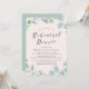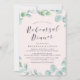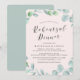 Elegante Einladungen für Proben sind ideal für Hochzeiten im Frühjahr und Sommer. Das Design umfasst einen modernen grünen botanischen Kranz, eine stilvolle Kalligraphie, einen hellrosa Hintergrund auf der Vorderseite und eine schluckige grüne Farbe auf der Rückseite (ändern Sie die Hintergrundfarbe mit dem Tool Anpassen).