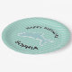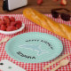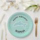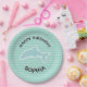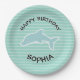 Niedliche Delphin-Illustration über blaue Streifen für ein "Happy Birthday" Party mit einem Wassersport- oder Strandthema, personalisiert mit einem Namen für jede Veranstaltung.