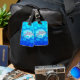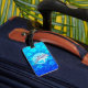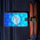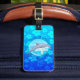 Der Delphin springend durch ein Maori- Sonnesymbol mit einem blauen Ozean und einem Segelboot hinter es. Blaue Honu Schildkröten und blaue Hibiskus-Blumen kopieren Hintergrund.