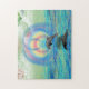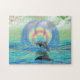 2 Delphine, die im Ozean nahe einem schönen Steigen von Farben und von Wasser mit 2 Planeten, einem Mond und einer bunten Sonne schwimmen. Rosa, Blaue, Aqua-, Gelbe und Grünefarben im Wasser und im Himmel.