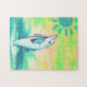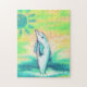Genießen Sie die Familienzeit, die dieses Puzzlespiel zusammenfügt, das eine Malerei eines Delphinherausspringens des Wassers mit einer großen blauen Sonne kennzeichnet.