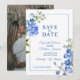 Schöne Delphinium Spikes bemalt blau botanische Kunst und Foto auf der umgekehrten Hochzeit speichern das Datum Einladung. Bearbeiten Sie diese Save the Date Hochzeitskarte mit Ihren eigenen Worten und einem besonderen Foto. Einzigartiges Design und originelle handbemalte Pan Aquarell feine Blume Kunst von Sarah Trett exklusiv für www.mylittleedenweddings.com auf Zazzle.