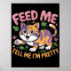 Diese humorvolle Grafik zeigt eine bezaubernde Cartoon-Katze mit einer auffallenden Mischung aus lila und orangefarbenem Fell, dargestellt in einer spielerischen, kauernden Pose mit einer gehobenen Pfote und einem fröhlichen, offenen Ausdruck. Um die anspruchsvolle Feline herum befinden sich kleine grüne Blätter und verschiedene rosa Pfotendrucke. Der fett rosa Text an den obersten Staaten "FÜTTRE mir", während der weiße Text unten deutlich Staaten "TELL ME I'M HÜBSCH", humorvoll verkapselt die primären Wünsche einer Katze. Das Design ist Set auf einem soliden schwarzen Hintergrund. Digitaler Download nur für den persönlichen Gebrauch.