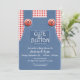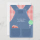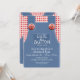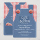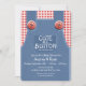 Niedlich als Knopfduscheinladung in geschlechtsneutralen rot-blauen Denim Overalls mit rotem Gingham-Shirt und Lollipop in der hinteren Hosentasche, Baby Dusche Einladung. Ideal für Bauernhofthemen oder rustikale Babyduschen.