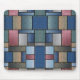 "Denim Patchwork" Eine symmetrische Anordnung texturierter, stoffähnlicher Rechtecke in gedämpften Tönen von Blau, Grün, Rosa und Beige. Das Layout ähnelt einem Patchwork-Quilt oder einem Mosaik, wobei jeder Block sorgfältig ausgerichtet ist, um eine ausgewogene, rasterähnliche Struktur zu schaffen.
