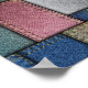 "Denim Patchwork" Eine symmetrische Anordnung texturierter, stoffähnlicher Rechtecke in gedämpften Tönen von Blau, Grün, Rosa und Beige. Das Layout ähnelt einem Patchwork-Quilt oder einem Mosaik, wobei jeder Block sorgfältig ausgerichtet ist, um eine ausgewogene, rasterähnliche Struktur zu schaffen.