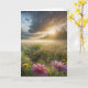 Eine lebendige Wiese bricht mit bunten Wildblumen unter einem dramatischen Himmel aus, wo das Sonnenlicht durch die Wolken strömt, während es regnet
