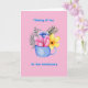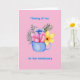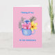 Aquarellanordnung von Blume Set in einem blauen Kaffee Tasse Set in einem rosa Hintergrund. Im Inneren der Karte steht "Lass das Abenteuer weiter"!