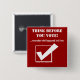 Ein lustiger politischer Knopf, der sagt: "Denke vor dem Votum!" in fett weißem Text auf einem roten Hintergrund und darunter "...sich erinnern, was beim letzten Mal passiert ist". Personalisierbar.