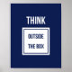 'Think' in weißen Hauptstädte, außerhalb des Kastens, das die Worte 'außerhalb des Kastens' in marineblau enthält. Spaß, nachdenklich und trügerisch einfach, ein witziger Slogan auf einem Poster.