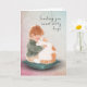 Denken Sie an Sie und senden Sie süße Kätzchen, Papier Grußkarte. Auf dem Cover ist eine aufdringliche Abbildung eines Jungen zu sehen, der eine weiße und orangefarbene Katze umarmt. Passen Sie die Nachricht im Inneren und den Text auf der Abdeckung an. Kunst, Bild und Vers Copyright Shoaff Ballanger Studios, 2025.
