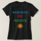 Dieses bunte Shirt kennzeichnet eine gelbe Sonne und den Text: Dennoch bestand sie fort. Dieses ist ein symbolischer Schlachtruf für den Mut und Integrität von Elizabeth Waren und alle Frauen geworden, die oben stehen für, was sie herein glauben. Leicht personifizieren Sie oder entfernen Sie den Text.